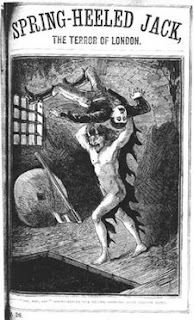 Character draws inspiration from the mythical "Spring-Heeled Jack." His attire loosely resembles that of an English nobleman with the addition of a tattered black cape connected to his wrists by gauntlets.